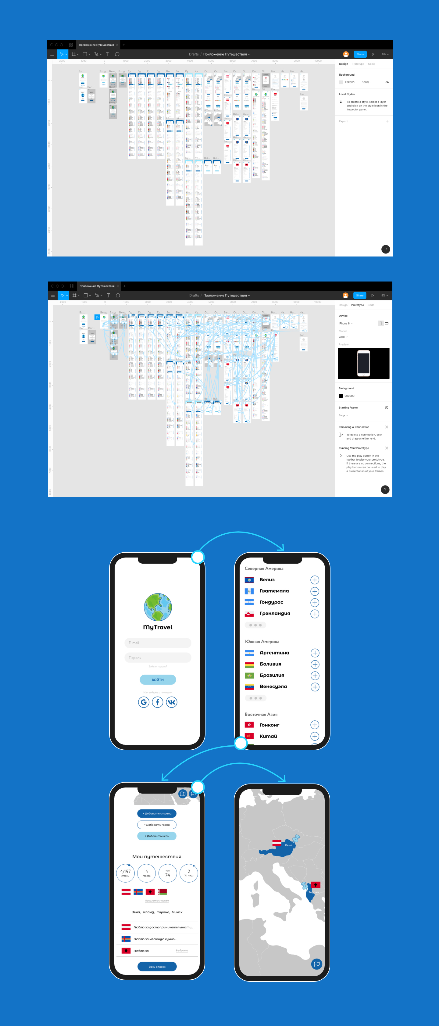 У заказчика была давняя мечта: создать мобильное приложение о путешествиях, где каждый желающий мог бы на карте отметить те страны, которые он посетил. В App Store уже были аналоги, но проведя подробный анализ, мы поняли, что сможем сделать гораздо лучше. Проблема заключалась в существенных функциональных ограничениях существующих решений. Поэтому нашим приоритетом была разработка подробного user journey, чтобы сделать приложение по-настоящему полезным компаньоном любого треволера. Вместо 7 запланированных экранов получилось 22. Внимание! Создание дизайна не проводилось.